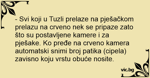 - Svi koji u Tuzli prelaze na pješačkom prelazu na crveno nek se pripaze zato što su postavljene kamere i za pješake. Ko pređe na crveno kamera automatski snimi broj patika (cipela) zavisno koju vrstu obuće nosite.