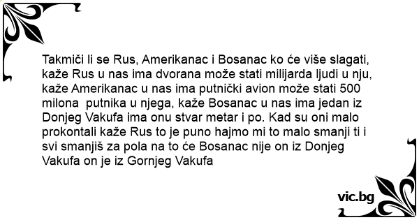 Takmiči li se Rus, Amerikanac i Bosanac ko će više slagati, kaže Rus u nas ima dvorana može stati milijarda ljudi u nju, kaže Amerikanac u nas ima putnički avion može stati 500 milona putnika u njega, kaže Bosanac u nas ima jedan iz Donjeg Vakufa ima onu stvar metar i po. Kad su oni malo prokontali kaže Rus to je puno hajmo mi to malo smanji ti i svi smanjiš za pola na to će Bosanac nije on iz Donjeg Vakufa on je iz Gornjeg Vakufa