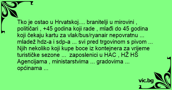Tko je ostao u Hrvatskoj.... branitelji u mirovini , političari , +45 godina koji rade , mlađi do 45 godina koji čekaju kartu za vlak/bus/ryanair nepovratnu ... mladež hdz-a i sdp-a ... svi pred trgovinom s pivom ... Njih nekoliko koji kupe boce iz kontejnera za vrijeme turističke sezone ... zaposlenici u HAC , HŽ HŠ Agencijama , ministarstvima ... gradovima ... općinama ...