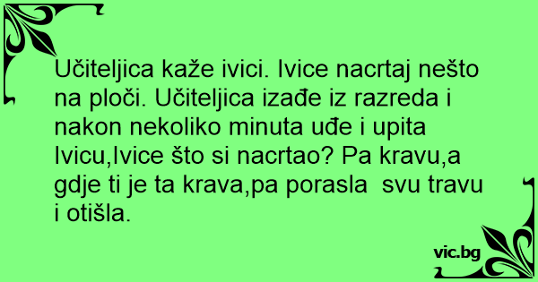 Učiteljica kaže ivici. Ivice nacrtaj nešto na ploči. Učiteljica izađe iz razreda i nakon nekoliko minuta uđe i upita Ivicu,Ivice što si nacrtao? Pa kravu,a gdje ti je ta krava,pa porasla svu travu i otišla.