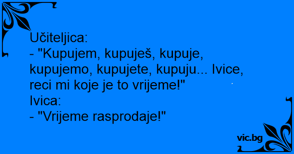 - "Kupujem, kupuješ, kupuje, kupujemo, kupujete, kupuju... Ivice, reci mi koje je to vrijeme!"
