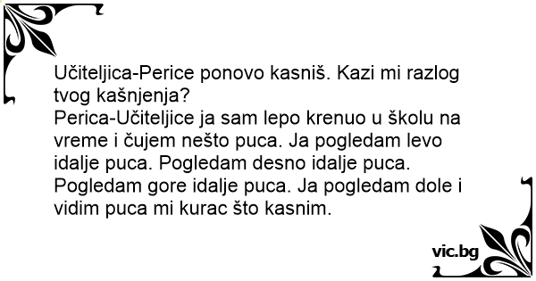 Učiteljica-Perice ponovo kasniš. Kazi mi razlog tvog kašnjenja? Perica-Učiteljice ja sam lepo krenuo u školu na vreme i čujem nešto puca. Ja pogledam levo idalje puca. Pogledam desno idalje puca. Pogledam gore idalje puca. Ja pogledam dole i vidim puca mi kurac što kasnim.