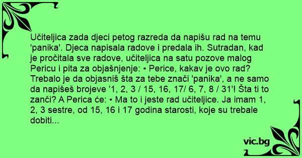 Učiteljica zada djeci petog razreda da napišu rad na temu 'panika'. Djeca napisala radove i predala ih. Sutradan, kad je pročitala sve radove, učiteljica na satu pozove malog Pericu i pita za objašnjenje: • Perice, kakav je ovo rad? Trebalo je da objasniš šta za tebe znači 'panika', a ne samo da napišeš brojeve '1, 2, 3 / 15, 16, 17/ 6, 7, 8 / 31'! Šta ti to zanči? A Perica će: • Ma to i jeste rad učiteljice. Ja imam 1, 2, 3 sestre, od 15, 16 i 17 godina starosti, koje su trebale dobiti menstruaciju 6, 7, i 8. u mjesecu, a danas je 31. Pa vi vidite kakva je panika vladala u našoj kući!