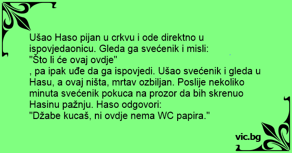 Ušao Haso pijan u crkvu i ode direktno u ispovjedaonicu. Gleda ga svećenik i misli: