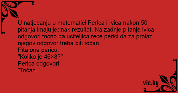 U natjecanju u matematici Perica i Ivica nakon 50 pitanja imaju jednak rezultat. Na zadnje pitanje ivica odgovori tocno pa uciteljica rece perici da za prolaz njegov odgovor treba biti točan.