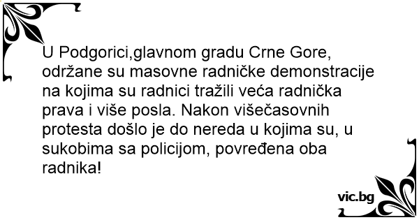 U Podgorici,glavnom gradu Crne Gore, održane su masovne radničke demonstracije na kojima su radnici tražili veća radnička prava i više posla. Nakon višečasovnih protesta došlo je do nereda u kojima su, u sukobima sa policijom, povređena oba radnika!