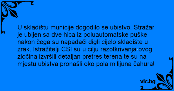 U skladištu municije dogodilo se ubistvo. Stražar je ubijen sa dve hica iz poluautomatske puške nakon čega su napadači digli cijelo skladište u zrak. Istražitelji CSI su u cilju razotkrivanja ovog zločina izvršili detaljan pretres terena te su na mjestu ubistva pronašli oko pola milijuna čahura!