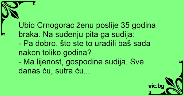 в затвора: Мажот ја уби жената по 35 години брак, и на судење судијата го прашува: - Добро бе по 35 години заеднички живот ја уби?! - А бе господине судија, од мрзливост, ај денес, ај утре!!!