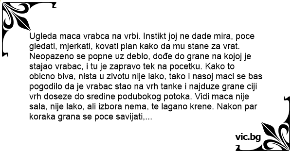 Ugleda maca vrabca na vrbi. Instikt joj ne dade mira, poce gledati, mjerkati, kovati plan kako da mu stane za vrat. Neopazeno se popne uz deblo, dođe do grane na kojoj je stajao vrabac, i tu je zapravo tek na pocetku. Kako to obicno biva, nista u zivotu nije lako, tako i nasoj maci se bas pogodilo da je vrabac stao na vrh tanke i najduze grane ciji vrh doseze do sredine podubokog potoka. Vidi maca nije sala, nije lako, ali izbora nema, te lagano krene. Nakon par koraka grana se poce savijati, te se maca u strahu da ju vrabac ne otkrije vrati na pocetak. Krene opet, vrati se i tako nekoliko рuта. Potraja to malo duze, pocelo joj se ciniti kako od svega nece biti nikakve koristi, te odluci da krene na sve ili nista. Krene opet, normalno, grana se opet savija, no ovog рuта nema vracanja nego napravi jos dva koraka, ucini joj se da u skoku moze doseci vrabca, naglo skoci, no istog momenta vrabac ju primjeti i odleti, a nasa junakinja se nađe usred potoka. Pouka: Sto predigra dulje traje, maca mokrija.