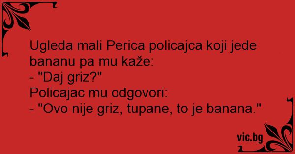 Ugleda mali Perica policajca koji jede bananu pa mu kaže: