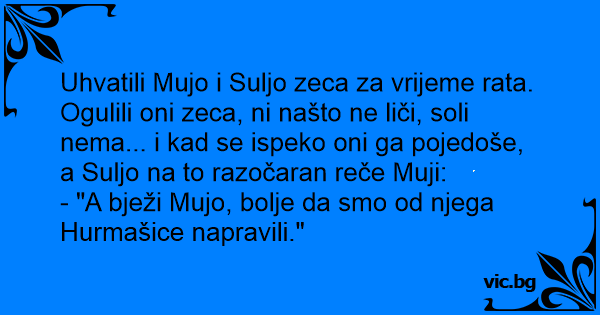 Ogulili oni zeca, ni našto ne liči, soli nema... i kad se ispeko oni ga pojedoše, a Suljo na to razočaran reče Muji: