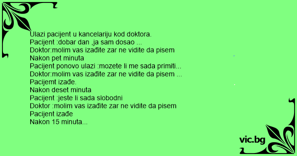 Ulazi pacijent u kancelariju kod doktora. Pacijent :dobar dan ,ja sam dosao ... Doktor:molim vas izađite zar ne vidite da pisem Nakon pet minuta Pacijent ponovo ulazi :mozete li me sada primiti... Doktor:molim vas izađite zar ne vidite da pisem ... Pacijemt izađe. Nakon deset minuta Pacijent :jeste li sada slobodni Doktor :molim vas izađite zar ne vidite da pisem Pacijent izađe Nakon 15 minuta Pacijent:doktore,jeste li sada slobodni? Doktor:molim vas izađite zar ne vidite da pisem Pacijent:pa vidim konju jedan ,hoš' jednom ispisat Doktor :a otkud tebi dabsam ja doktor,ja sam pisac i trenunto niste u bolnici Pacijent : izvini doktore imam slabo pamcenje!!!