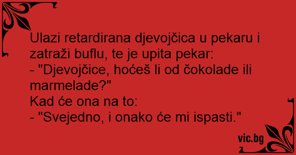 Ulazi retardirana djevojčica u pekaru i zatraži buflu, te je upita pekar: