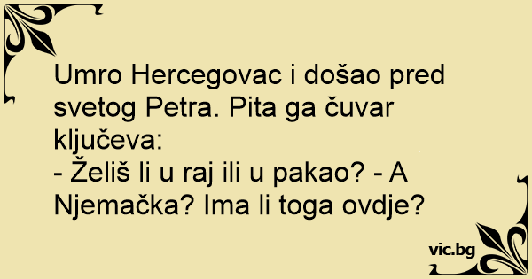 Umro Hercegovac i došao pred svetog Petra. Pita ga čuvar ključeva: