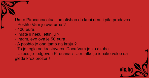 Umro Pirocancu otac i on otishao da kupi urnu i pita prodavca :