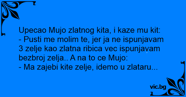 - Pusti me molim te, jer ja ne ispunjavam 3 zelje kao zlatna ribica vec ispunjavam bezbroj zelja.. A na to ce Mujo: