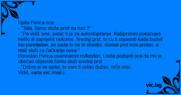 Dorastao Perica osamnaesti rođendan, i tada podsjeti oca da mu je obećao objasniti čemu služi srednji prst.