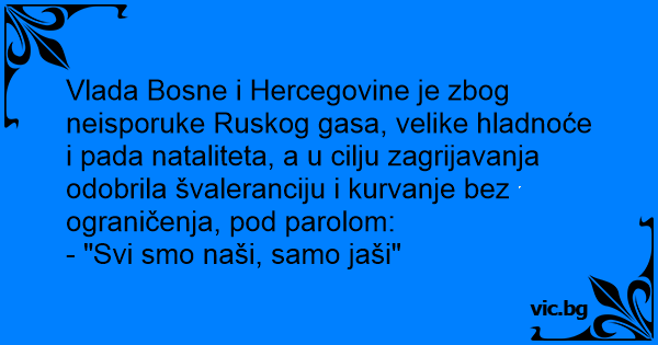 Vlada Bosne i Hercegovine je zbog neisporuke Ruskog gasa, velike hladnoće i pada nataliteta, a u cilju zagrijavanja odobrila švaleranciju i kurvanje bez ograničenja, pod parolom: