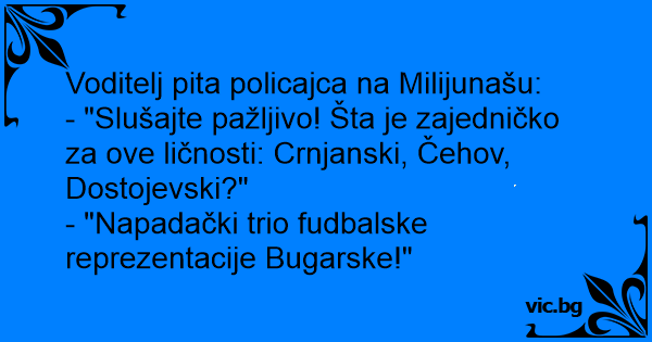 - "Slušajte pažljivo! Šta je zajedničko za ove ličnosti: Crnjanski, Čehov, Dostojevski?"