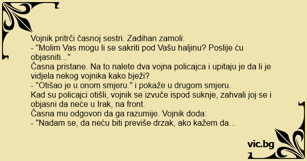 Kad su policajci otišli, vojnik se izvuče ispod suknje, zahvali joj se i objasni da neće u Irak, na front.
