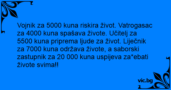Vojnik za 5000 kuna riskira život. Vatrogasac za 4000 kuna spašava živote. Učitelj za 5500 kuna priprema ljude za život. Liječnik za 7000 kuna održava živote, a saborski zastupnik za 20 000 kuna uspijeva za*ebati živote svima!!