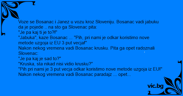 Voze se Bosanac i Janez u vozu kroz Sloveniju. Bosanac vadi jabuku da je pojede .. na sto ga Slovenac pita: