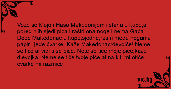 Voze se Mujo i Haso Makedonijom i stanu u kupe,a pored njih sjedi рiса i raširi ona noge i nema Gaća. Dode Makedonac u kupe,sjedne,raširi među nogama papir i jede čvarke. Kaže Makedonac:devojče! Neme se tiče al vidi ti se piče. Nete se tiče moje piče,kaže djevojka. Neme se tiče tvoje piče,al na kiti mi otiče i čvarke mi razmiče.