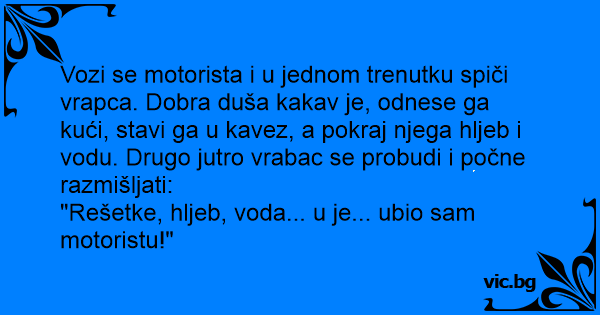 Vozi se motorista i u jednom trenutku spiči vrapca. Dobra duša kakav je, odnese ga kući, stavi ga u kavez, a pokraj njega hljeb i vodu. Drugo jutro vrabac se probudi i počne razmišljati: