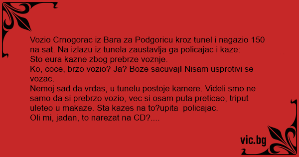 Vozio Crnogorac iz Bara za Podgoricu kroz tunel i nagazio 150 na sat. Na izlazu iz tunela zaustavlja ga policajac i kaze: