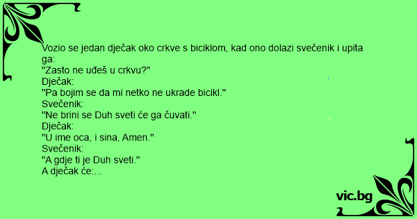 Vozio se jedan dječak oko crkve s biciklom, kad ono dolazi svečenik i upita ga: