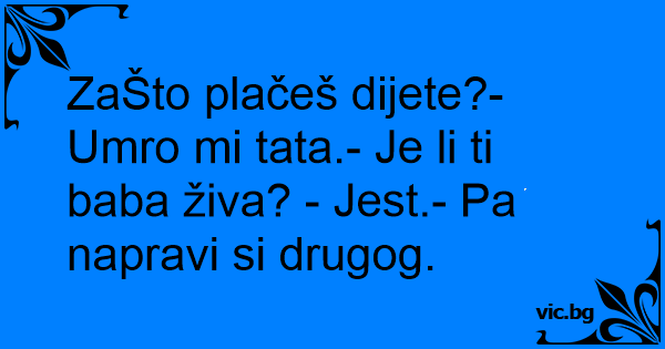ZaŠto plačeš dijete?- Umro mi tata.- Je li ti baba živa? - Jest.- Pa napravi si drugog.