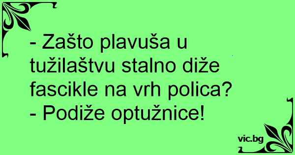 - Zašto plavuša u tužilaštvu stalno diže fascikle na vrh polica? - Podiže optužnice!