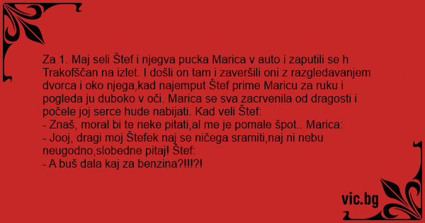 Za 1. Maj seli Štef i njegva pucka Маriса v auto i zaputili se h Trakofščan na izlet. I došli on tam i zaveršili oni z razgledavanjem dvorca i oko njega,kad najemput Štef prime Maricu za ruku i pogleda ju duboko v oči. Маriса se sva zacrvenila od dragosti i počele joj serce hude nabijati. Kad veli Štef: