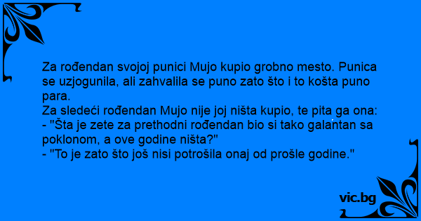 - "Šta je zete za prethodni rođendan bio si tako galantan sa poklonom, a ove godine ništa?"