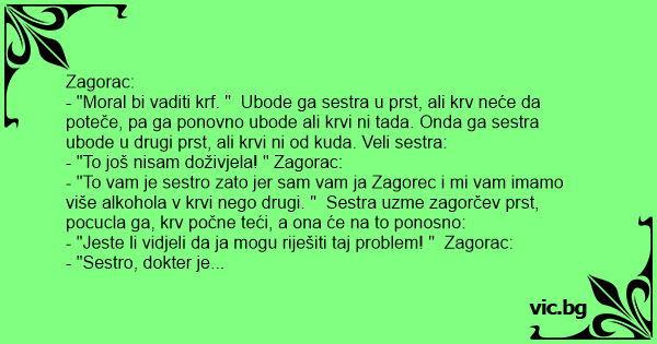 - "To vam je sestro zato jer sam vam ja Zagorec i mi vam imamo više alkohola v krvi nego drugi. " Sestra uzme zagorčev prst, pocucla ga, krv počne teći, a ona će na to ponosno: