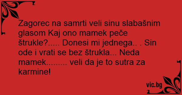 Zagorec na samrti veli sinu slabašnim glasom Kaj ono mamek peče štrukle?..... Donesi mi jednega.. . Sin ode i vrati se bez štrukla... Neda mamek......... veli da je to sutra za karmine!