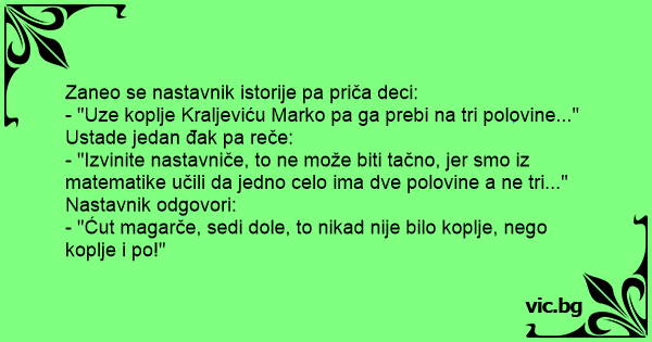 - "Izvinite nastavniče, to ne može biti tačno, jer smo iz matematike učili da jedno celo ima dve polovine a ne tri..."