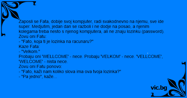 Zaposli se Fata, dobije svoj kompjuter, radi svakodnevno na njemu, sve ide super. Medjutim, jedan dan se razboli i ne dodje na posao, a njenim kolegama treba nesto s njenog kompjutera, ali ne znaju lozinku (password). Zovu oni Fatu: