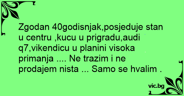 Zgodan 40godisnjak,posjeduje stan u centru ,kucu u prigradu,audi q7,vikendicu u planini visoka primanja .... Ne trazim i ne prodajem nista ... Samo se hvalim .