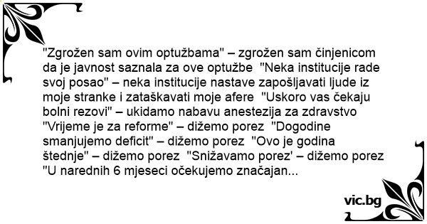"Zgrožen sam ovim optužbama" – zgrožen sam činjenicom da je javnost saznala za ove optužbe "Neka institucije rade svoj posao" – neka institucije nastave zapošljavati ljude iz moje stranke i zataškavati moje afere "Uskoro vas čekaju bolni rezovi" – ukidamo nabavu anestezija za zdravstvo "Vrijeme je za reforme" – dižemo porez "Dogodine smanjujemo deficit" – dižemo porez "Ovo je godina štednje" – dižemo porez "Snižavamo porez' – dižemo porez "U narednih 6 mjeseci očekujemo značajan priljev stranog kapitala" – uzimamo novi kredit od Amerikanaca "On je uspješan poslovni čovjek" – on je moj kolega ratni profiter "Ovim potezom ostvarili smo značajne uštede" – u ovom potezu, usprkos silnom trudu, nitko od nas nije uspio pronaći nikakav interes "Ministar ima moju punu podršku" – ministar ima informacije koje mi mogu puno naštetiti "Ova Vlada ima jasnu strategiju" – za svaki loš potez optuživat ćemo prethodnu Vladu "Vrijeme je za nove mjere zapošljavanja mladih" – prevelik broj mladih s našom članskom iskaznicom i dalje je nezaposlen "Možda" – vaš projekt je odličan, ali niste naveli kakva je moja korist "Ne" – vaš projekt je odličan, ali ne vidim vlastiti interes "Da" – zadovoljan sam količinom ponuđenog mita "Hahahahahahahahaha" – izrazito sam nezainteresiran za vaš prijedlog potpore projektu čiji je cilj opće dobro i kojeg neće popratiti mediji "To je gnjusna, notorna i zlonamjerna laž" – krađa o kojoj me pitate dogodila se točno tako kako ste opisali "Nemam komentara" – iznenađen sam snagom vaših argumenata i upoznatošću s ovom krađom "To su veoma ozbiljne optužbe" – znam koga ću okriviti za ovu krađu "To su smiješne optužbe" – totalno sam kriv za ovu krađu