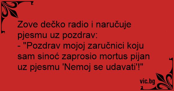 - "Pozdrav mojoj zaručnici koju sam sinoć zaprosio mortus pijan uz pjesmu 'Nemoj se udavati'!"