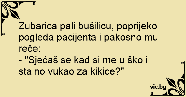 Zubarica pali bušilicu, poprijeko pogleda pacijenta i pakosno mu reče: