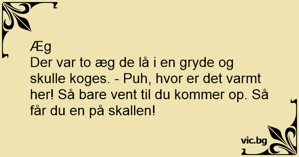 Der var to æg de lå i en gryde og skulle koges. - Puh, hvor er det varmt her! Så bare vent til du kommer op. Så får du en på skallen!