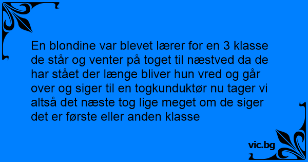 En blondine var blevet lærer for en 3 klasse de står og venter på toget til næstved da de har stået der længe bliver hun vred og går over og siger til en togkunduktør nu tager vi altså det næste tog lige meget om de siger det er første eller anden klasse