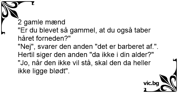"Nej", svarer den anden "det er barberet af.". Hertil siger den anden "da ikke i din alder?"