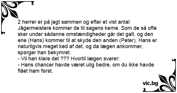 2 herrer er på jagt sammen og efter et vist antal Jägermeistere kommer de til sagens kerne. Som de så ofte sker under sådanne omstændigheder går det galt, og den ene (Hans) kommer til at skyde den anden (Peter). Hans er naturligvis meget ked af det, og da lægen ankommer, spørger han bekymret.