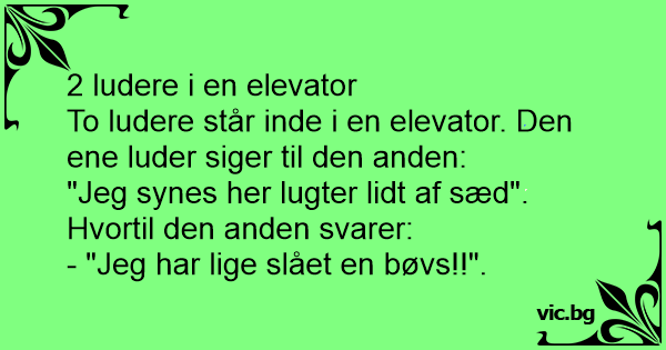 2 hoertjes staan in de lift Zegt de ene tegen de andere: "Hey, het ruikt hier naar sperma" Zegt die andere: "Oeps sorry boertje gelaten..."