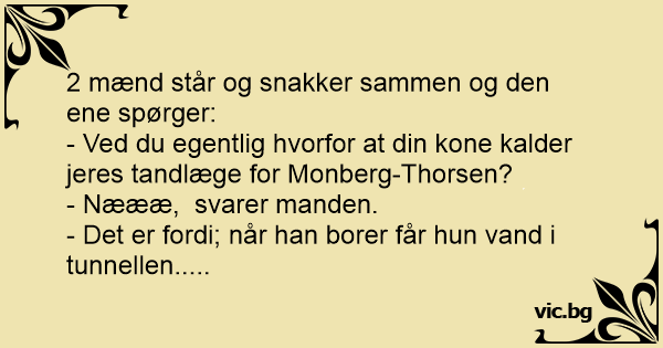 - Ved du egentlig hvorfor at din kone kalder jeres tandlæge for Monberg-Thorsen?