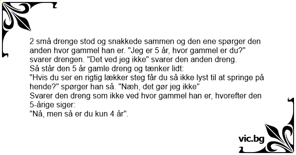 2 små drenge stod og snakkede sammen og den ene spørger den anden hvor gammel han er. "Jeg er 5 år, hvor gammel er du?" svarer drengen. "Det ved jeg ikke" svarer den anden dreng.