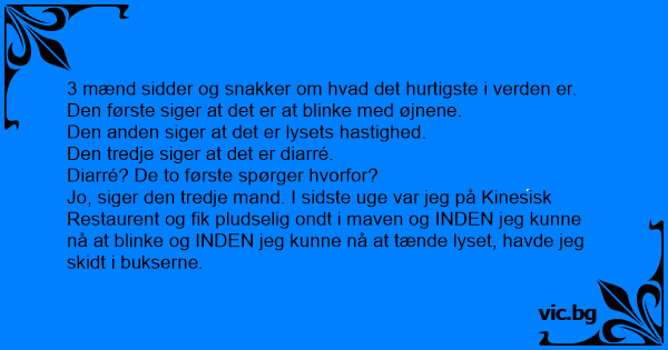 Jo, siger den tredje mand. I sidste uge var jeg på Kinesisk Restaurent og fik pludselig ondt i maven og INDEN jeg kunne nå at blinke og INDEN jeg kunne nå at tænde lyset, havde jeg skidt i bukserne.